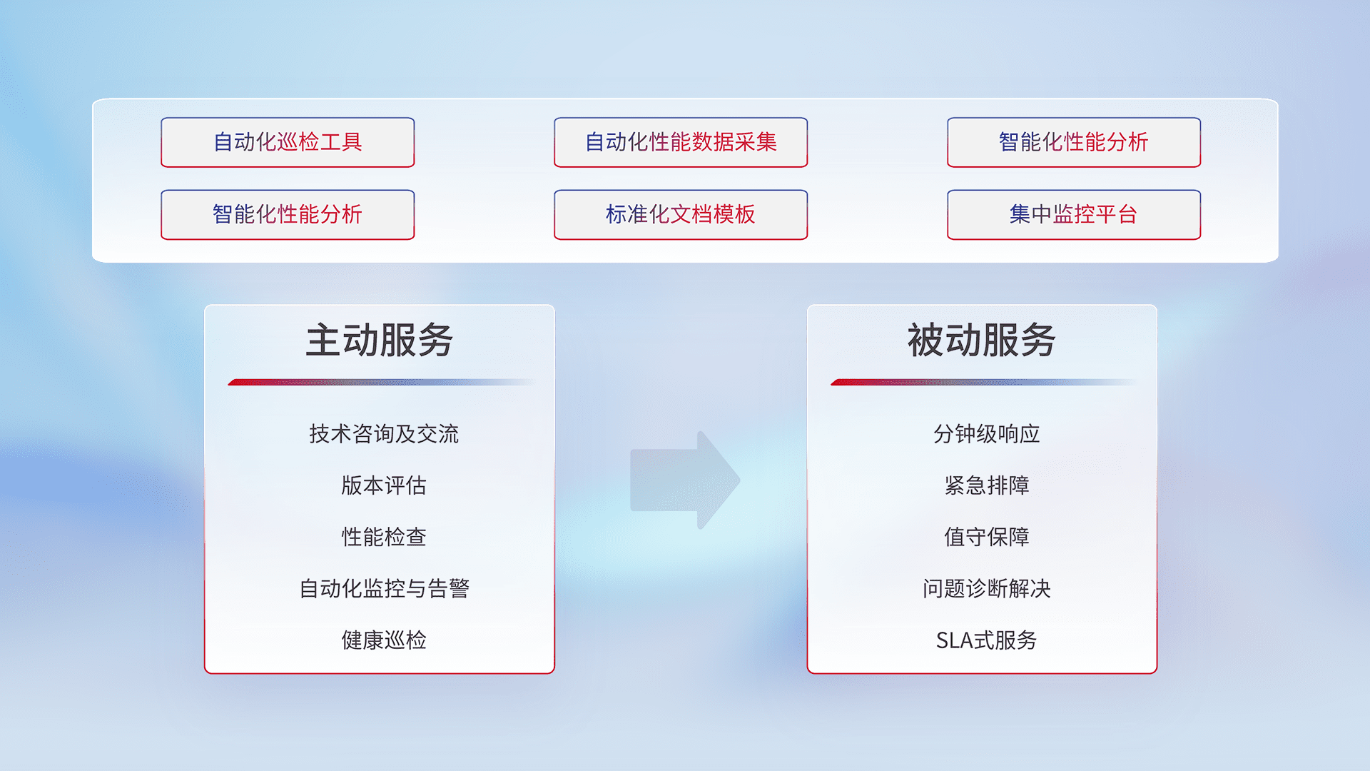 智能化工具和标准化文档,,保障服务质量,,提供主动服务(包含技术咨询、、、、版本评估、、、性能检查、、自动化监控与告警、、健康巡检)和被动服务包含(分钟级响应、、紧急排障、、值守保障、、问题诊断解决、、、SLA服务)。。。