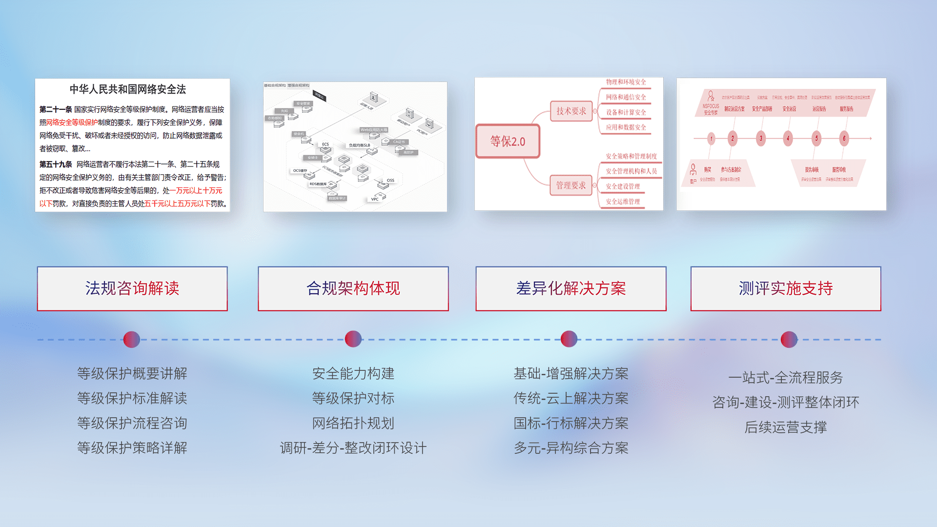 通过专业的法律咨询解读、、、、合规架构体现、、、、差异化解决方案、、、、测试实施支持等服务,,为客户量身打造等保合规体系。。。。