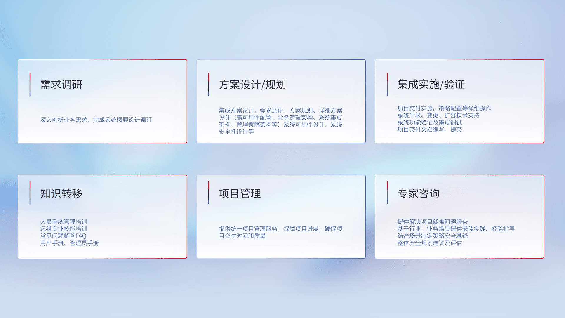 针对客户行业特性,,,,将宏观的安全战略和需求,,,,通过专业的交付服务,,实现项目落地,,为客户提供标准规范的集成交付服务。。